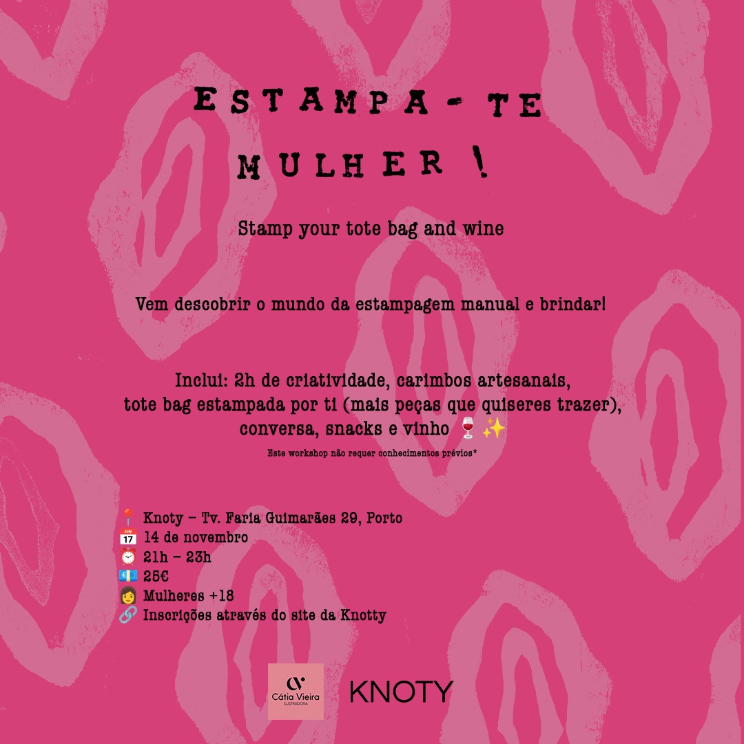 É com enorme prazer que anunciamos o workshop “Estampa-te Mulher! | Stamp your Tote Bag & Wine”, com a ilustradora @catiavieira_ilustra , no dia 14 de novembro, das 21h às 23h, no espaço KNOTY.